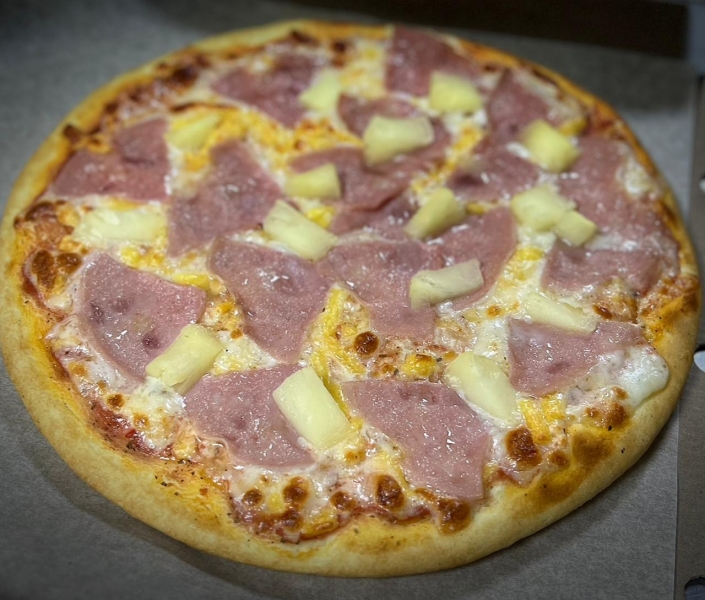 Ветчина халяль, ананасы, томатный соус со специями, сыр моцарелла, сыр гауда